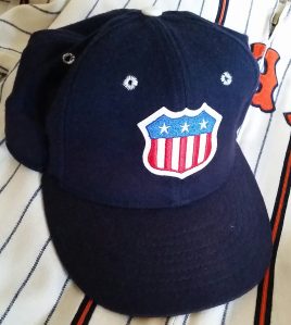 This stars and stripes shield patch was was born from the Hale American HEALTH patch that began as part of a patriotic initiative in 1942. This vintage reproduction Seals cap dates from the early 1990s and was made by Ebbets Field Flannels.
