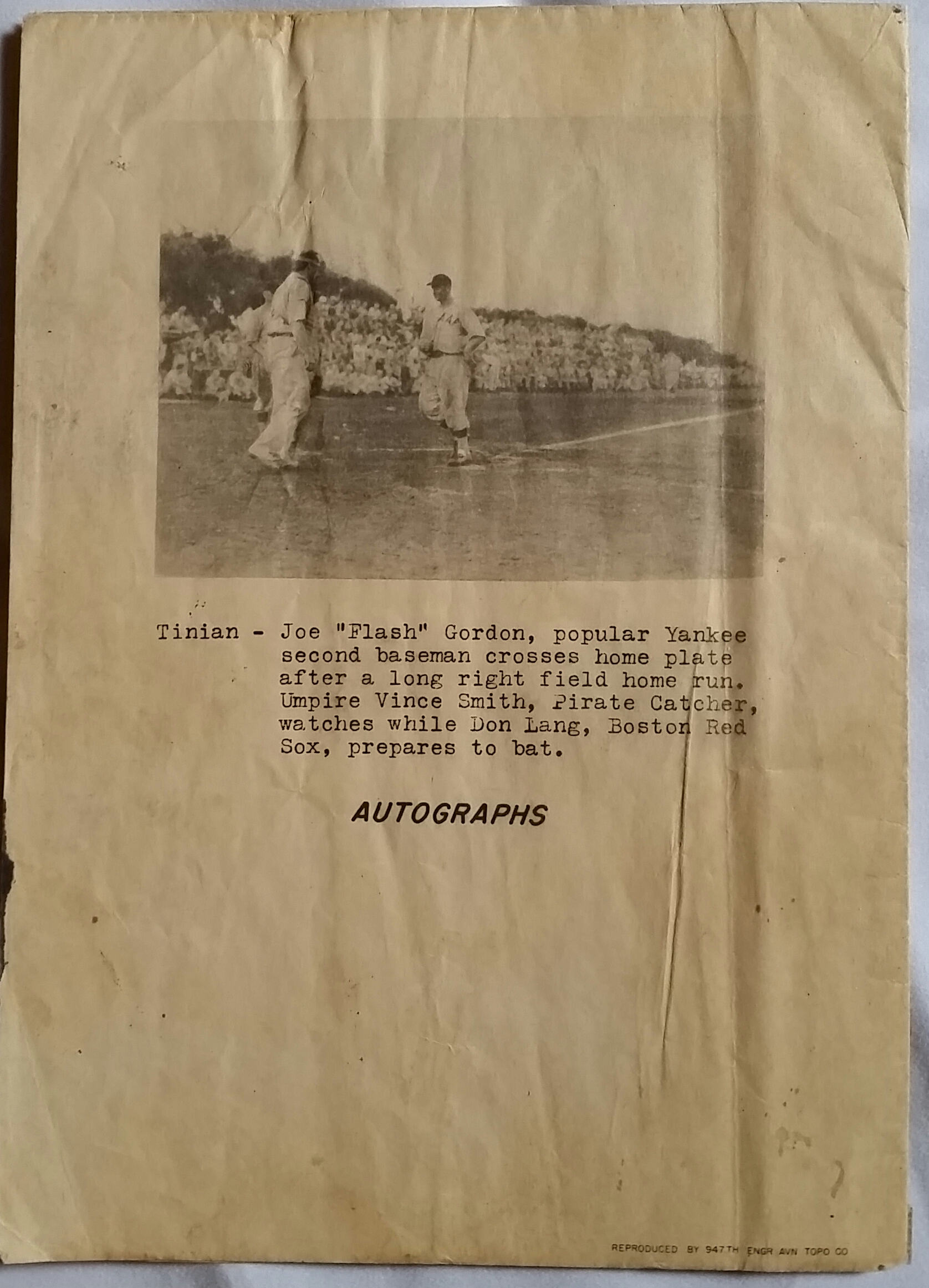 Joe “Flash” Gordon, popular Yankee second baseman crosses home plate after a long right field home run. Umpire Vince Smith, Pirate Cather watches while Don Lang, Boston Red Sox, prepares to bat.