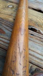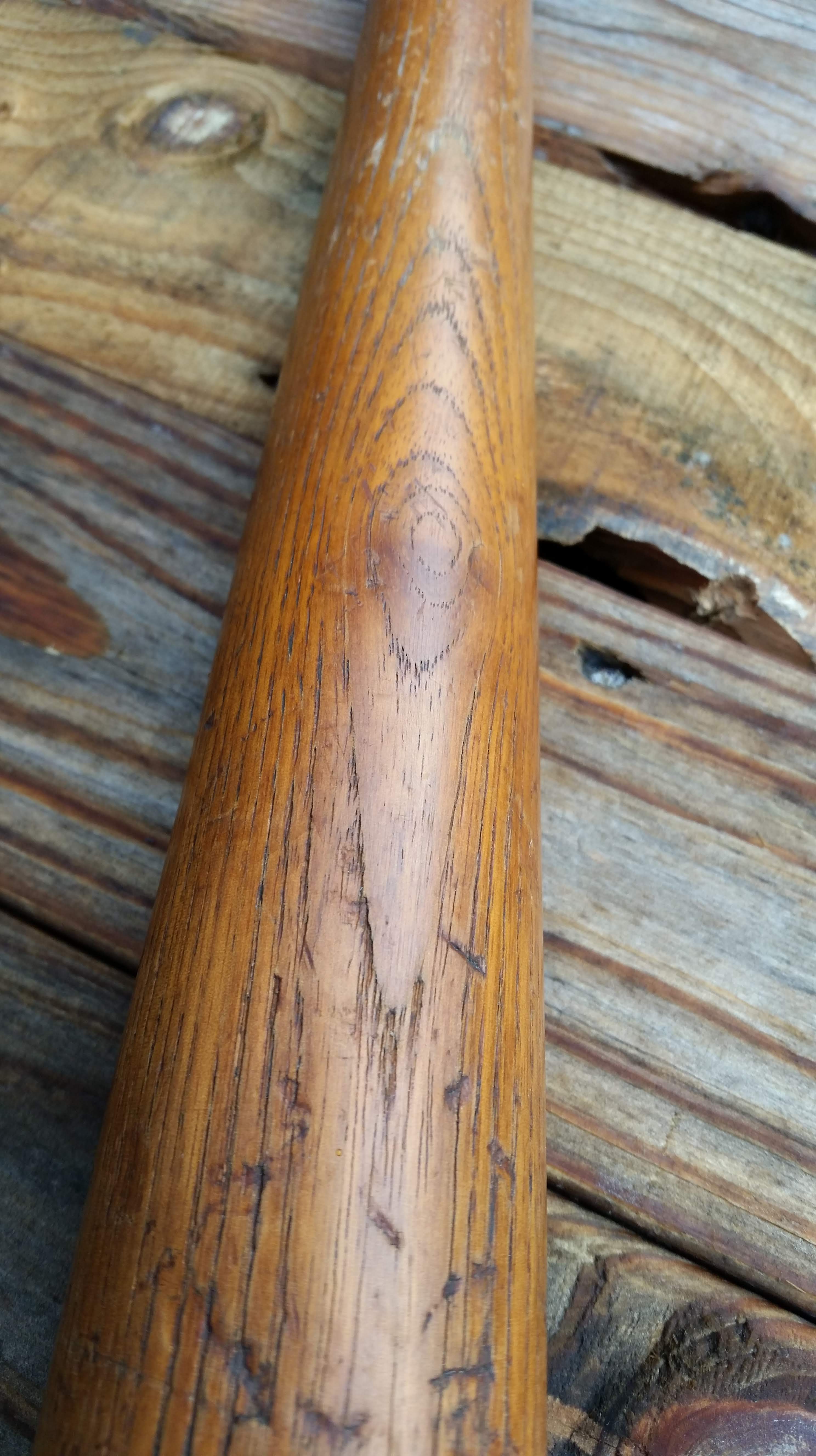 Aside from the nicks and divots in the bat’s surface, the darker stained wood shows beautiful grain and figuring.