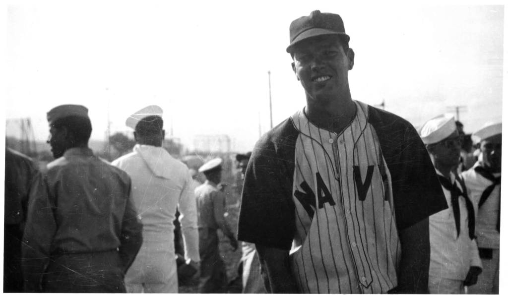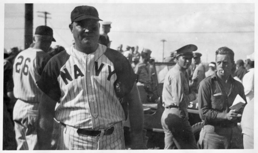 When a group of four snapshot photographs of candidly posed Navy baseball players was listed at auction a while ago, I didn’t hesitate to place my sniped bids based solely upon the subjects in each image. Each central subject was of a ballplayer wearing a baseball uniform surrounded by teammates, opponents and servicemen. The crowds in the background seemed to indicate that the images were captured following the conclusion of a game that was played before crowds of Navy and Marine Corps personnel. Each of the four central ball players seemed to have recognizable faces. I was certain of the identities of two of the four men and set out to identify the other two. The seller listed the photos stating that they originated from an estate of a husband and wife who were both serving in the armed forces and stationed at Pearl Harbor during World War II.