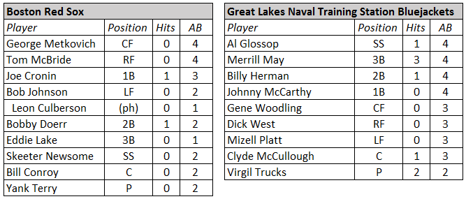 From the first pitch, Trucks dominated the war-depleted Red Sox as he baffled Boston hitters by fanning 12 and surrendering only two hits (future Hall of Famers Bobby Doerr and Cronin each singled) in the contest. Meanwhile, the Bluejackets hitters seemed to be unfazed by Red Sox starting pitcher Yank Terry‘s offerings as five of Great Lakes batsmen touched him for hits including two by Trucks). With the score knotted with one run a piece heading into the bottom of the eighth inning the Bluejackets hitters scored two runs following Clyde McCullough’s lead-off single (who was pushed from first to third base on Al Glossop’s base knock). McCullough scored on a double by Virgil Trucks and Billy Herman sealed the game by driving in Trucks with a sacrifice fly to right field.