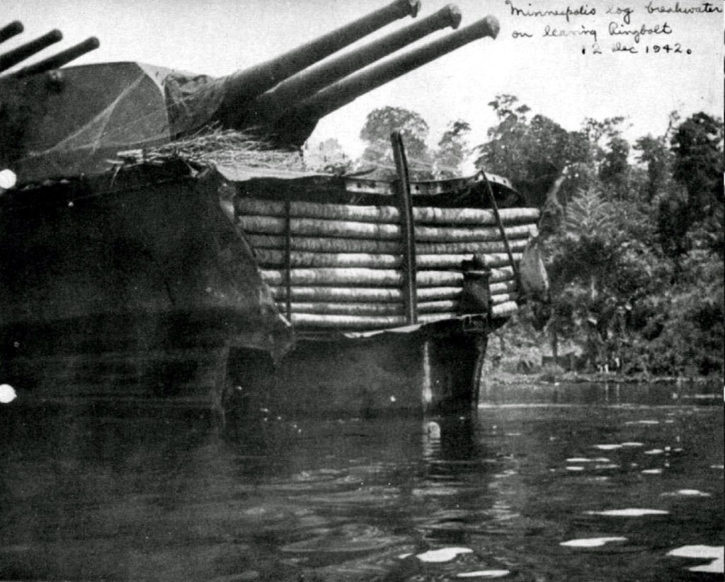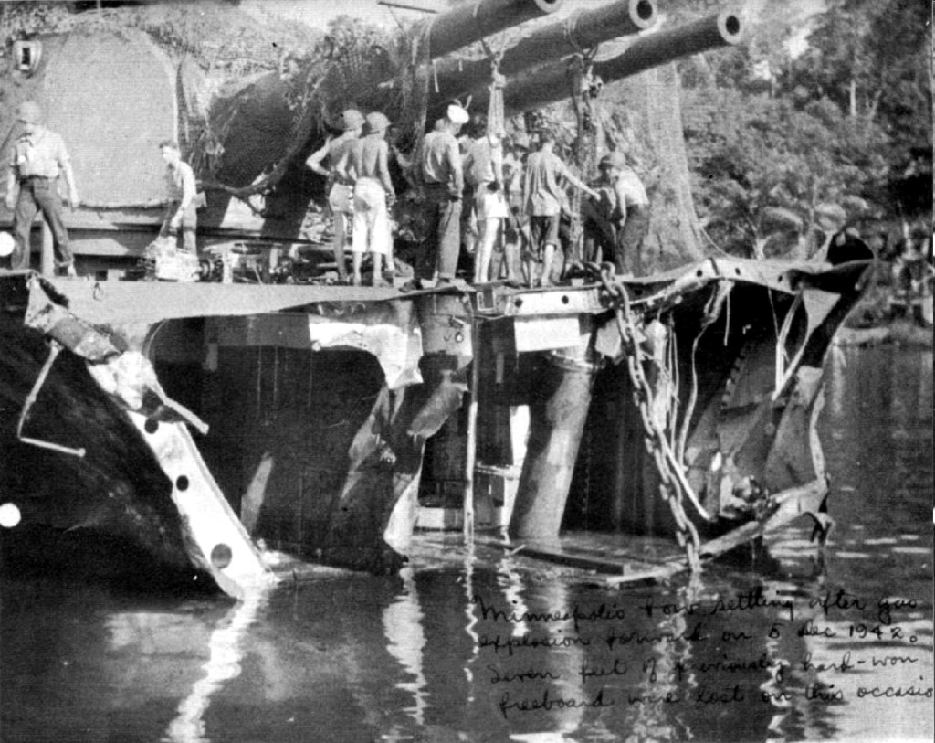Sessions continued to see action in the Eastern Solomons in late August and by November of 1942 with the waters surrounding the islands near Guadalcanal earning the nickname, “Iron Bottom Sound” due to inordinate numbers of ships being sunk by both allied and Japanese forces, the Battle of Tassafaronga would mark the painful end of the Minneapolis’ service in the area. During the battle, the “Minny” was engaging the Japanese destroyer Takanami (crippling her) that was part of a group of six enemy combatants when a second group surprised the American ship’s crew. The Minneapolis sustained two Long Lance torpedo hits: one on the port bow and the other in her number two fire room, causing loss of power and severe damage. Her bow collapsed, her port side badly ruptured, and two fire rooms open to the sea, the American cruiser was out of the battle as her crew battled fires and flooding to keep their ship afloat. Thirty seven of Sessions’ shipmates were killed in the attack.