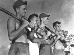 The most consistent design used across all branches during WWII was a six-panel crown made of dark (navy) blue wool with a leather sweatband. Whether plain or with an emblem attached to the front panels, these hats were common throughout the armed forces service teams. In addition to what was seen on the military diamonds, caps were worn by some personnel within the ranks of the various branches as part of their working uniforms. From the outside of the caps, they can appear to be identical to those worn by players on the field (in some instances, these hats could be distinguishable by the presence of a military stock or supply number inside of the sweatband). Wool caps were standard military supply system-stocked item for aeronautical materials Class-37 and was available for appropriation in three colors; red, green and blue (the blue color was so dark that it appeared, in many instances to be black).