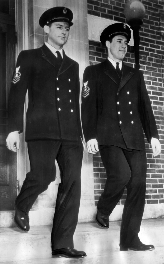 January 23, 1942: Chapman Joins Feller. Chapman and Feller leave their barracks for a tour of inspection of the Naval Training Station here after Chapman reported for duty today. Both are Chief Specialists in the Physical Fitness Program (Chevrons and Diamonds Collection).