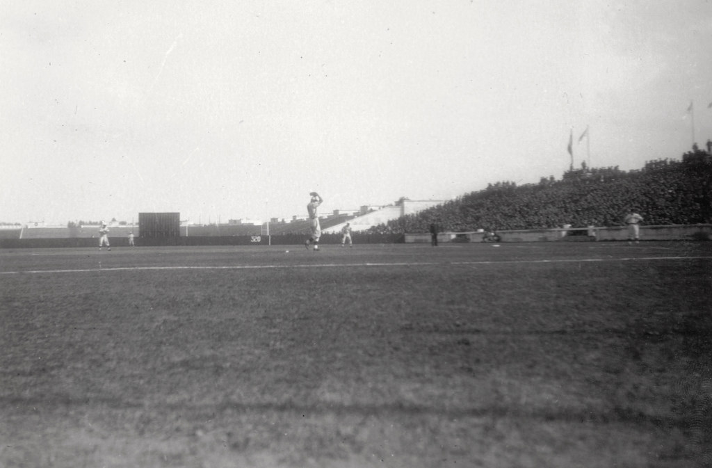 The pitcher (possibly Earl Ghelf) starts his windup in one of their US Army Ground Forces Championship Series Games against the 7ist Inf. Red Circlers.