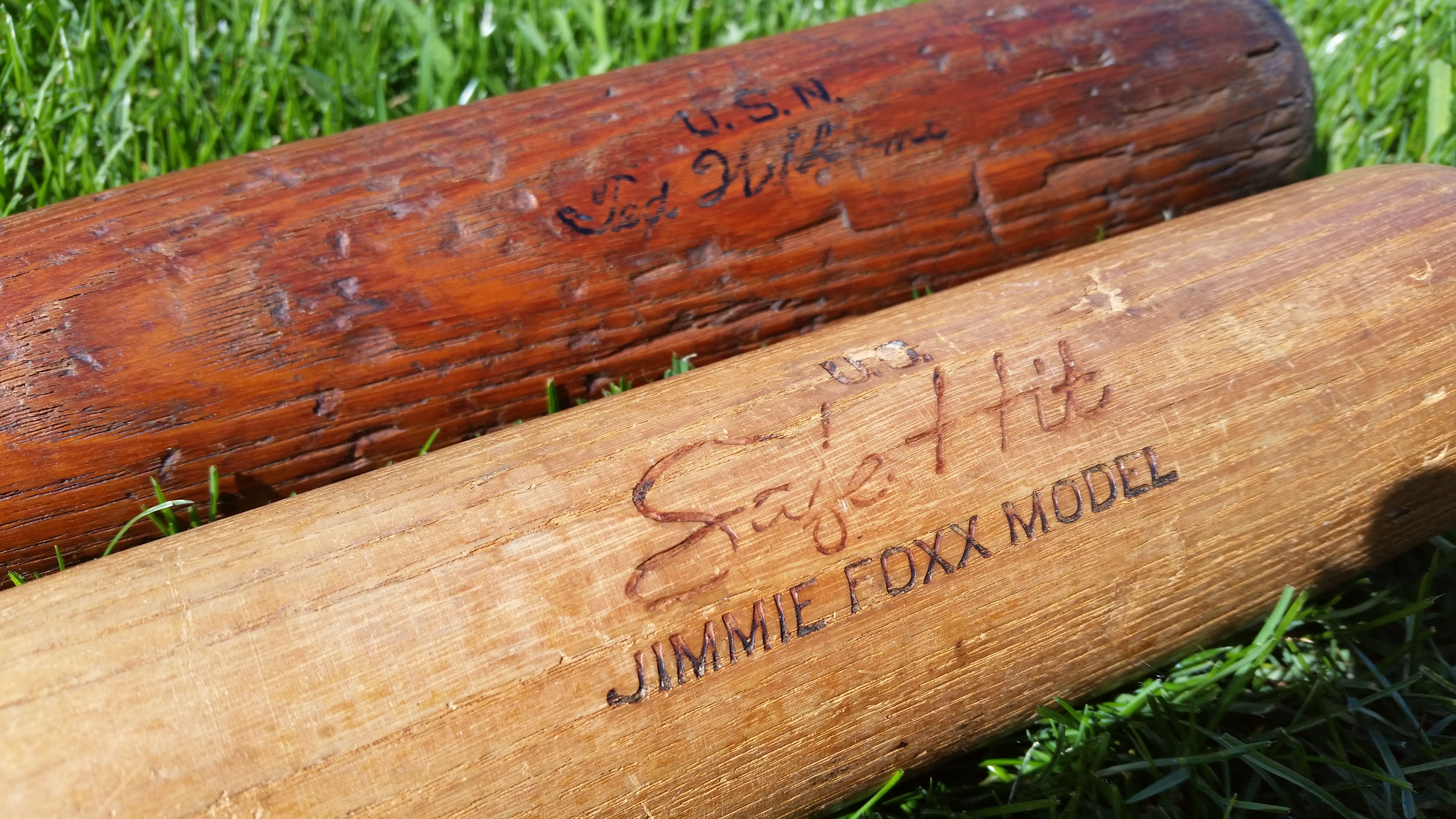 Far from perfect, the “U.S.N.” stamped Ted Williams signature bat is paired with the “U.S.” stamped Jimmie Foxx “Safe Hit” model bats made by Hillerich & Bradsby (Chevrons and Diamonds Collection).