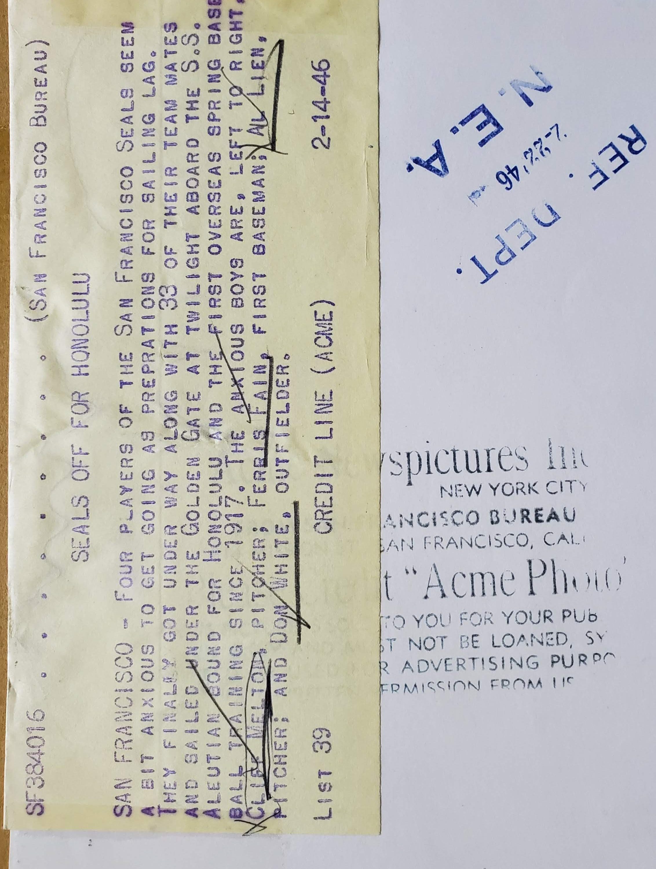 This ACME Newspictures-marked photograph also includes their N.E.A. marking and the affixed paper caption.