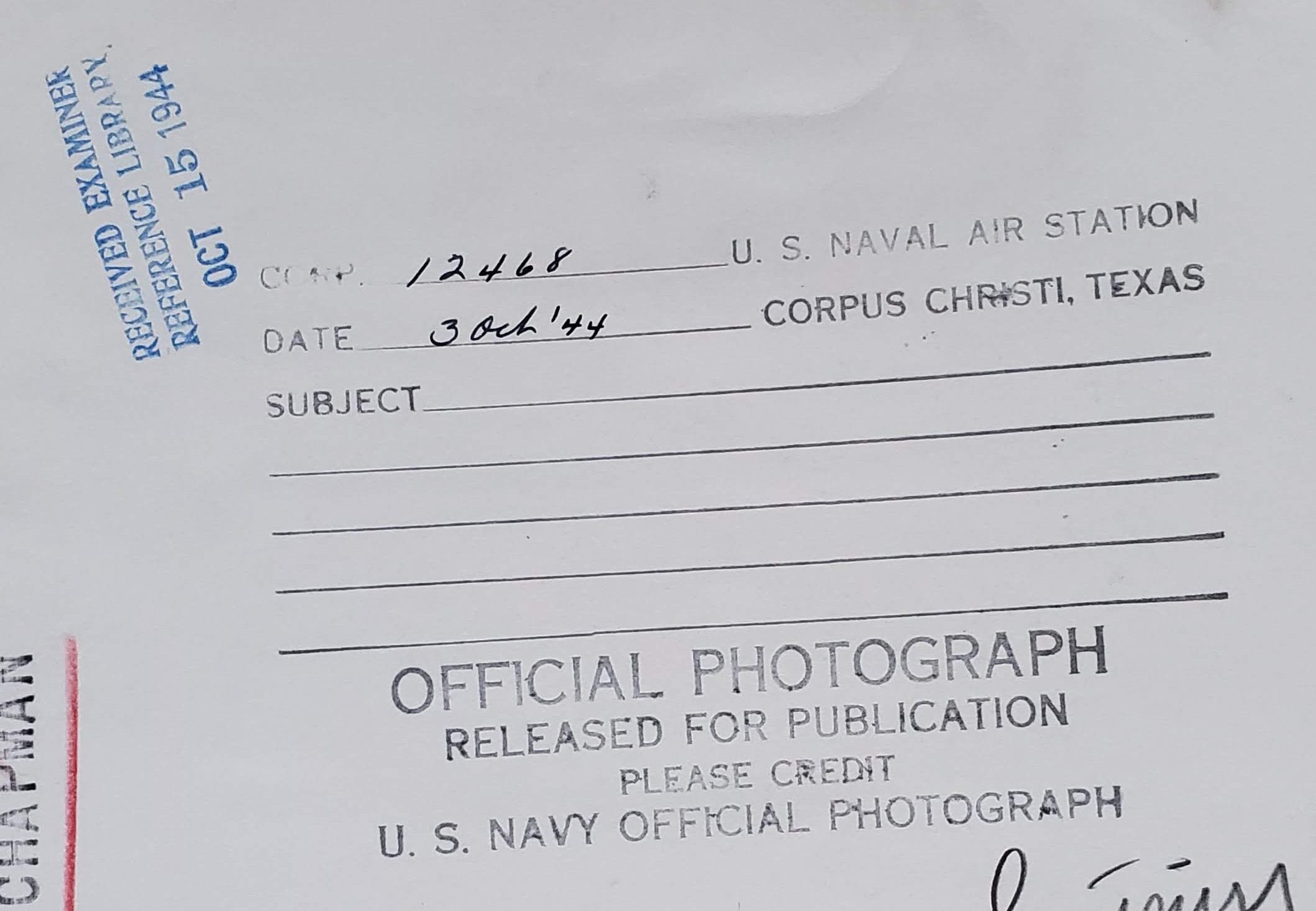 The back of this photograph has a lot going on. Aside from the handwritten note (lower right corner) and the stamp to the far left with the player’s name, the principal stamp from the U.S. Navy indicates that this was produced and distributed to the press by the public relations department a Naval Air Station,…