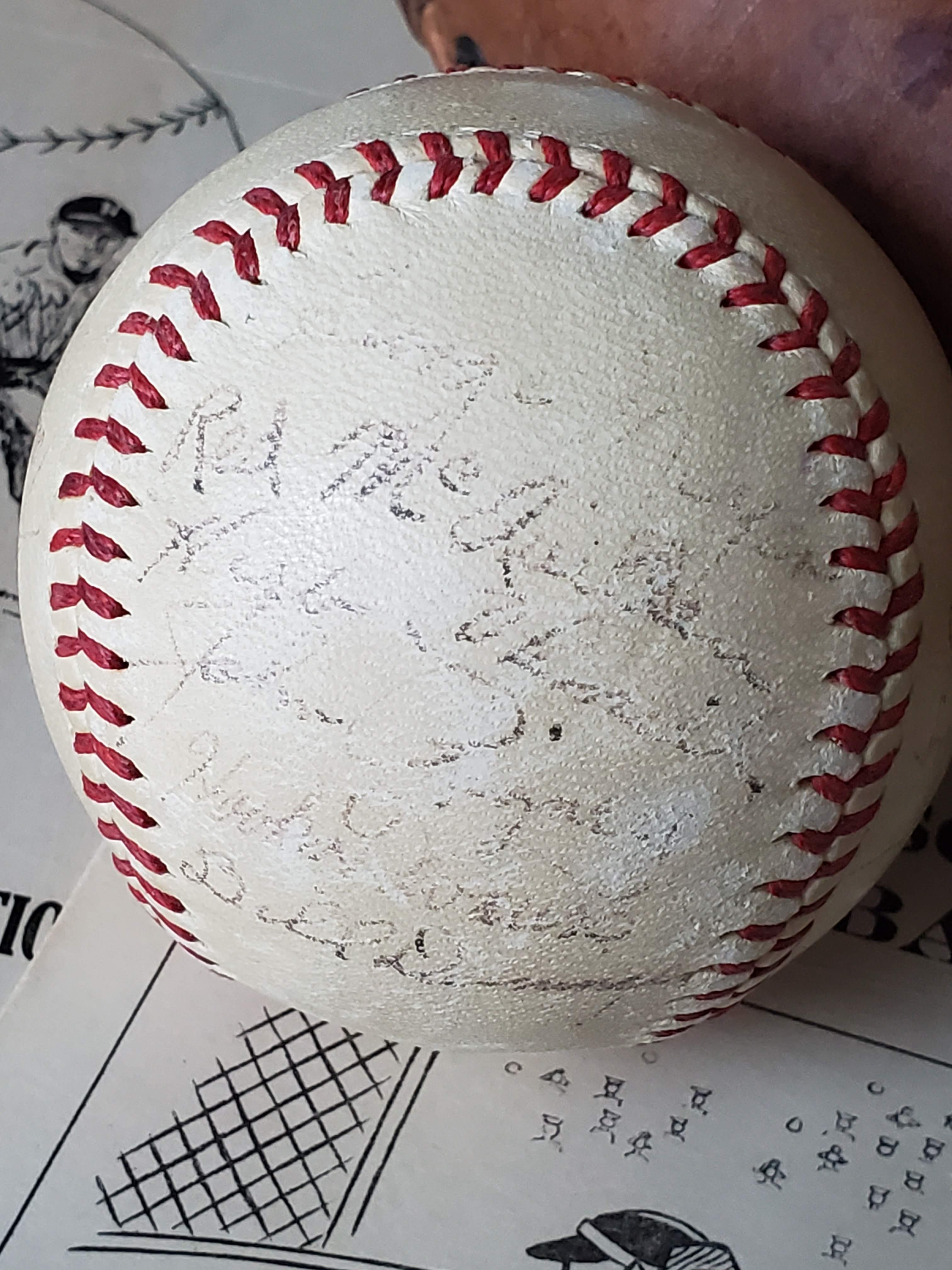 Showing signatures from the 1944 Norfolk NTS Bluejackets: George Meyer, “Red” McQuillen, Herb Schmiel, Johnny Rigney, “Hooks” Devaurs and Bill Deininger.