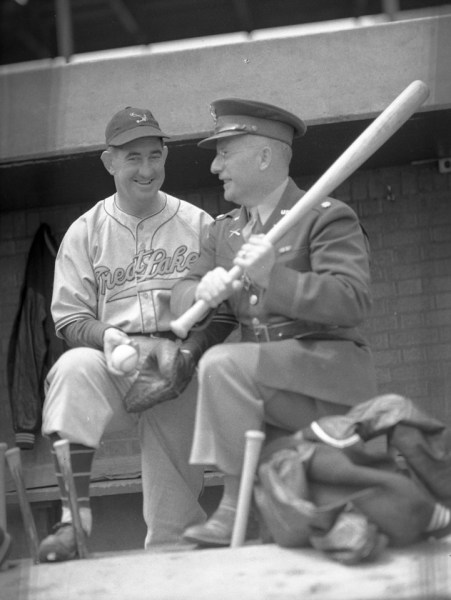 One could assert that of the service teams that played ball during World War II, two of the best (if not THE best) teams were from the Navy’s largest recruit training stations. On the Atlantic coast, the Norfolk (Virginia) Naval Training Station Bluejackets team was the product of Captain Henry McClure and Chief Bosun Gary Bodie and in the Midwest, another Bluejackets team based at the Great Lakes Naval Training Station (located north of Chicago, Illinois on the western shores of Lake Michigan) was managed by former Philadelphia Athletics and Detroit Tigers great, Lieutenant Commander Mickey Cochrane. During Cochrane’s leadership of the Great Lakes team from 1942 through 1944, the team amassed a combined record of 163 wins against 26 losses (and one tie) against competition ranging from major and minor league clubs, other service teams and industrial teams. Cochrane would reach out to ballplayers (who had not yet been drafted or enlisted for wartime service) and recruit them to join the Navy with the notion that they would play baseball for his team for the season.