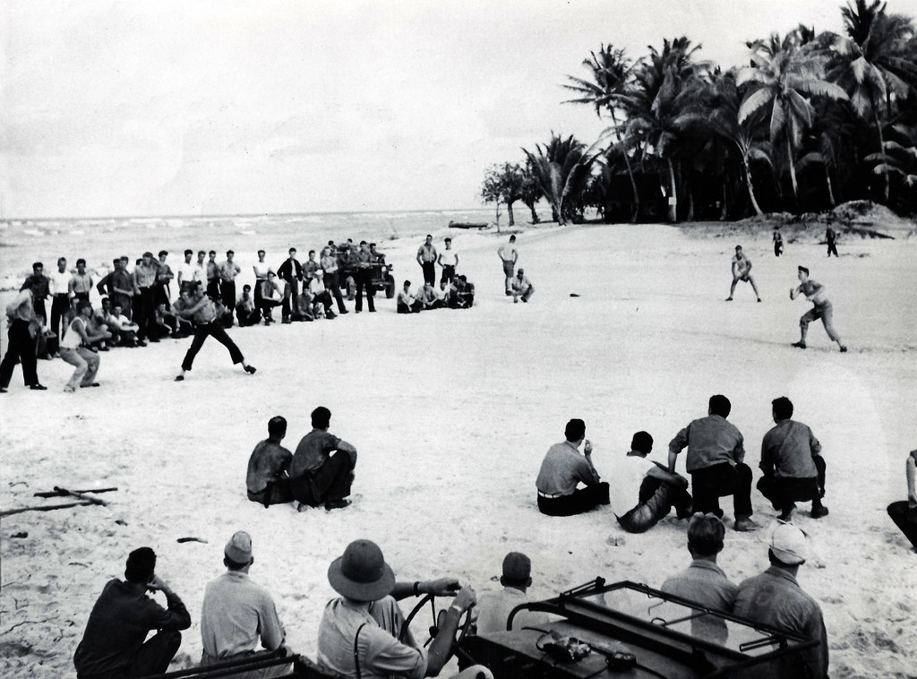 Nearly anyone who wore a military uniform understands from experience that one can adapt to surroundings making even the most environmentally unfriendly situation seem a little bit like home. In the absence of a suitable place to sleep, a GI can get shuteye in almost any location or situation whether being drenched in a tropical rain squall or on the hot steel deck surrounding a shipboard gun mount, soldiers, marines, sailors and airmen have little difficulty making do. Coming off the front lines and taking time out for respite and a breather from the monotony and intensity of wartime service presents troops with opportunity for recreation. Up until the conflicts faced by the post-Vietnam War service members, baseball was the truly the “American Pastime” which meant that a ball and glove (if not a bat) wasn’t too far out of a GI’s reach.