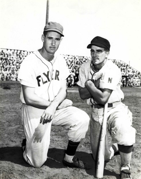 Ted Williams, of Oahu’s “Marine Flyers” poses next to his former “Red Sox” and “Cloudbusters” teammate, Johnny Pesky of the NAS Honolulu “Crossroaders” (Chevrons and Diamonds collection).