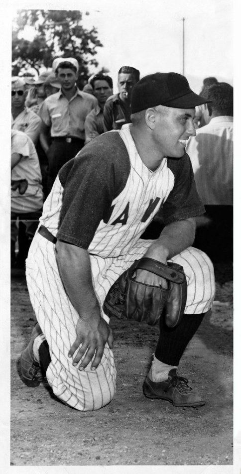 Gene Woodling wearing his Navy flannels takes a knee. This photo was heavily modified by a newspaper photo editor requiring heavy-handed correction when added to our collection. Note Woodling’s U.S.N. stamped glove (Chevrons and Diamonds collection).