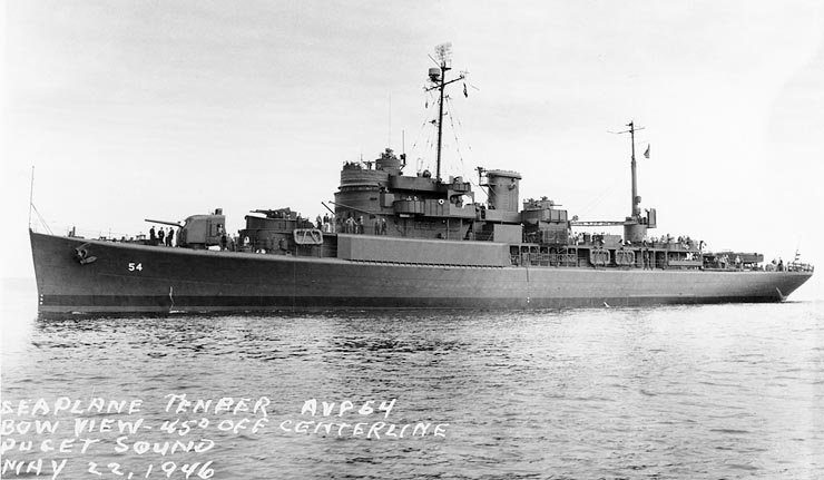 The ship, USS Timbalier (AVP-54), was a Barnegat-class seaplane tender that was named for Timbalier Bay, which lies to the north of Timbalier Island and is partially enclosed by its north shore. Timbalier Island (which is uninhabited), considered one of Louisiana’s barrier islands, is located 75 miles west of the mouth of the Mississippi River. The seaplane tender was authorized by Congress in the months following the Japanese attack on Pearl Harbor. AVP-54’s keel was laid on November 9, 1942 at the Lake Washington Shipyard (near present-day Kirkland, Washington) on the eastern shore of the large lake. Construction proceeded slowly at the small shipyard, prompting Navy leaders to transfer the unfinished vessel to Puget Sound Navy Yard (known today as Puget Sound Naval Shipyard in Bremerton, Washington) in early 1944. Sixteen months later, the vessel, still incomplete, was moved back to the Lake Washington Shipyard facilities and would not be completed until the spring of the following year, eight months after the unconditional surrender of Japan and the end of World War II.