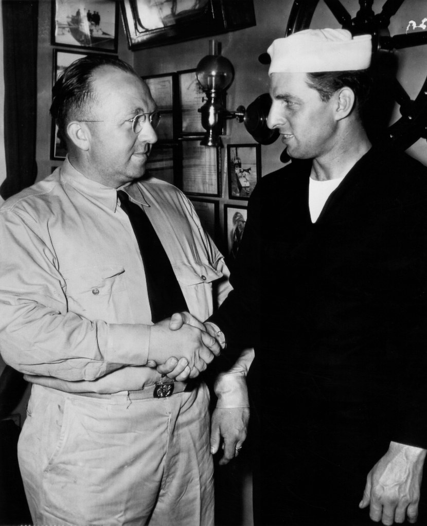 Tommy Henrich, New York Yankee outfielder, is greeted by Chief Boatswain’s Mate Hugh M. Brown as he reports for duty at the Buffalo (NY) Coast Guard base. Henrich will be assigned to the service’s physical fitness program, September 2, 1942 (Chevrons and Diamonds Collection).