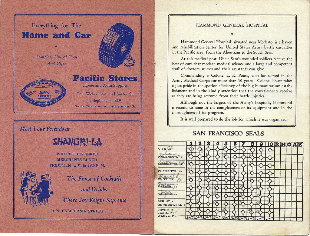 Victors over Portland and Seattle in successive Shaughnessy playoffs, the Seals come here today to meet one of the best all-service nines assembled in the West to play in a benefit game dedicated to a great cause – the athletic and recreation fund of the Hammond General Hospital at Modesto. Our thanks, therefore, also are extended to the commanding officers of the various army posts who released their all-star players to make this contest a reality.