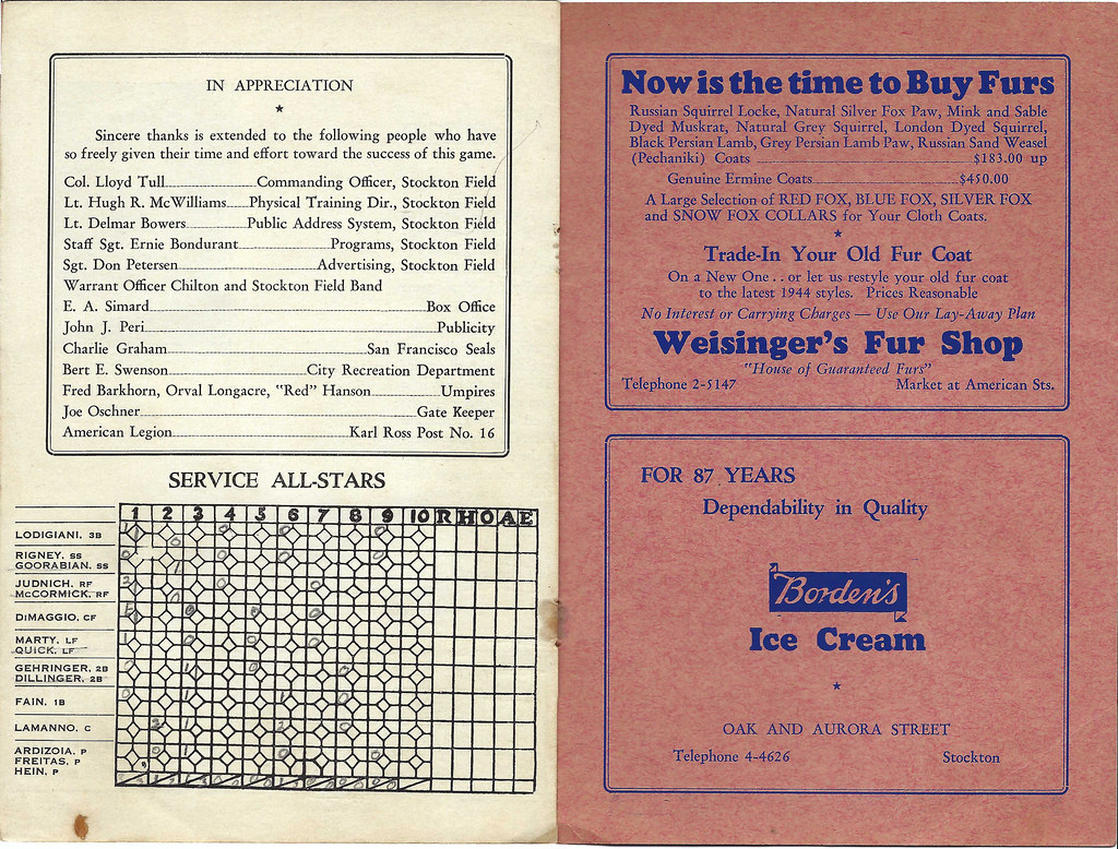 “The U.S. Army Air Forces and Stockton Field take this opportunity to express their appreciation to the San Francisco Seals, 1943 Pacific Coast League baseball champions, for their cooperation in making today’s game possible.