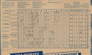 On the field, the game was exciting as the Giants got ahead of Brooklyn’s Whit Wyatt, 2-0, with a single and a run scored by Johnny Mize (driven in by Buster Maynard) in the top of the second inning and single and run scored by Giants pitcher Cliff Melton to lead off the top of the third (driven in on a sacrifice fly by Mel Ott).