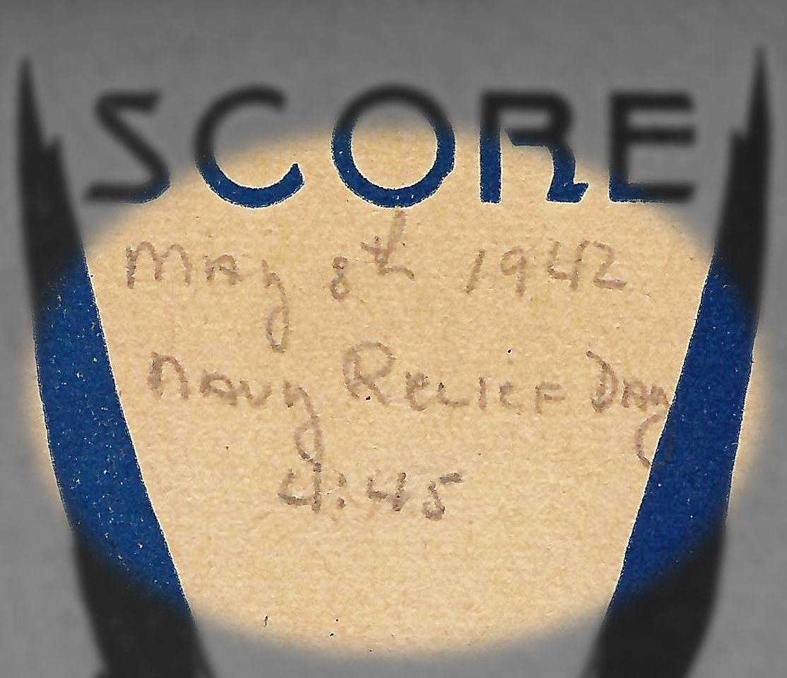 The significance of the game was not lost on the scorecard’s original owner as the twilight start time of the first service relief game was played in support of the Navy Relief Society. This note is inscribed on the top of the scorecard (Chevrons and Diamonds collection)