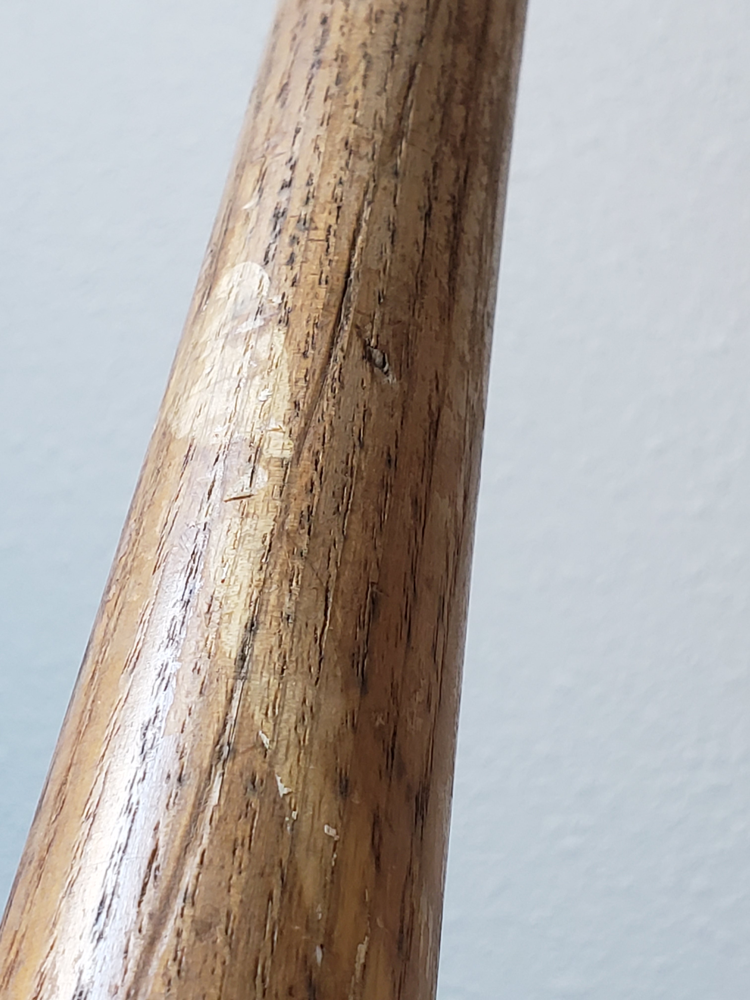 This deep gouge will be a permanent fixture on the Charlie Keller bat’s handle (Chevrons and Diamonds Collection).
