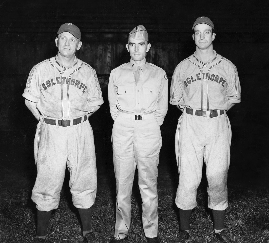 The Oglethorpe offense had a two-run Claude Trivett blast over the right field fence in the bottom of the second, sending Joe Lazenby to the showers. In the fourth inning, with the Army ahead, 5-2, Buddy Bates knocked a 3-1 Beazley pitch to left field, driving in two runs. The former Card only allowed two more hits for the remainder of the game, though the Navy would score an unearned run as one of the two hits plated a baserunner who reached on a walk and was moved into scoring position on an error. Private Charlie Heffner, formerly of the Kingsport Cherokees (Class “D” Appalachian League) led off the bottom of the fifth inning with a single. A wild pitch by Miller allowed him to reach second base, followed by a fielder’s choice that pushed him to third. Carvel “Bama” Rowell drove Heffner home with a base hit to left field. The score remained 6-5 through the end of the game, with Oglethorpe finishing on top.