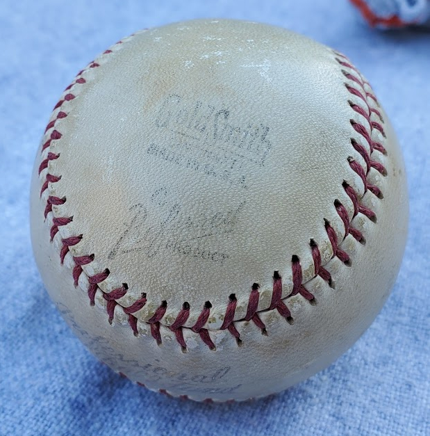 When the ball arrived, we able to take a closer look at the manufacturer’s markings as well as the Professional Base Ball Fund stamp. Made by GoldSmith, the stamps on the ball were used by the company from 1940 to 1944. After inspecting both the manufacturer’s and the Professional Base Ball Fund stamps, the ball was easily confirmed to have been used by or issued to the 1943 Norfolk NTS ball club.