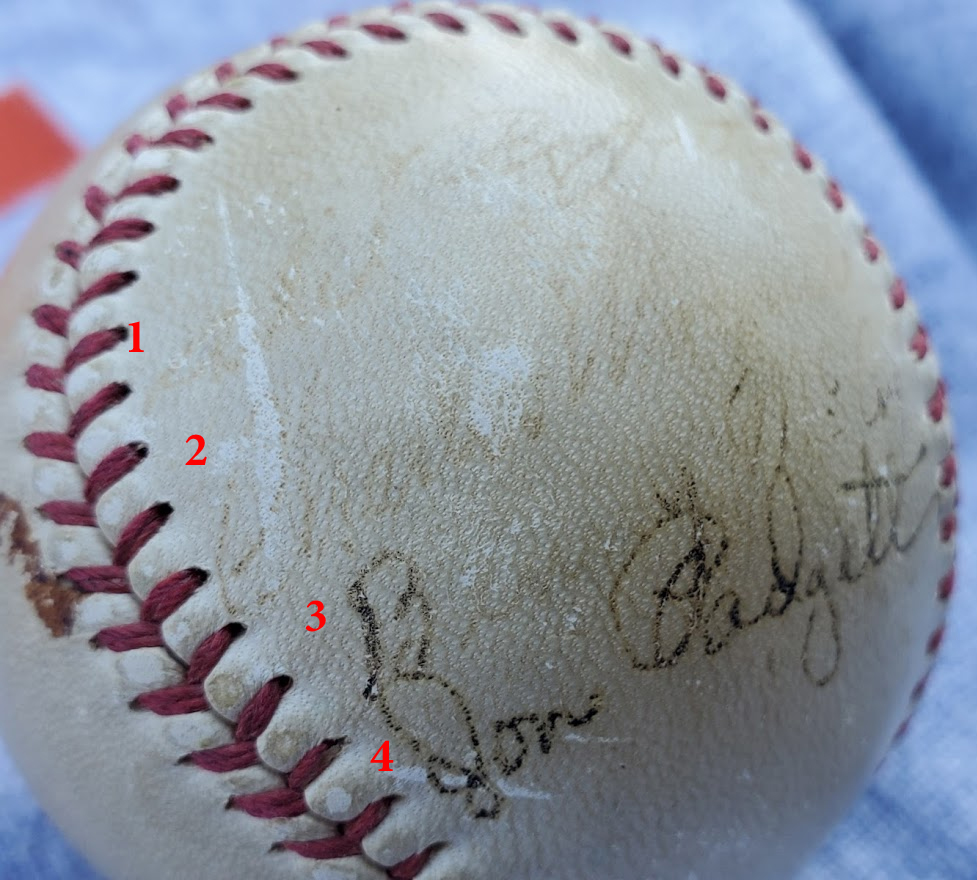 Locating a “Professional Base Ball Fund” baseball with signatures from the 1943 Bluejackets is no easy feat. However, we managed to find a ball that includes signatures from some of the key Norfolk NTS Bluejackets players. As with our 1944 NNTS ball, the 1943 signed baseball has unfortunately been exposed to excessive UV that caused significant fading. Photos of the ball as it was listed in an online auction showed one prominent autograph from former St. Louis Cardinals catcher and outfielder Don Padgett along with heavily faded ink marks from other players. Due to the deterioration of the autographs, the baseball was very affordable. Because we were in pursuit of the ball with our primary motivation being the “Professional Base Ball Fund” stamp, we reached a deal with the seller. Once in our hands, we were able to discern several of the many more details that were not visible in the auction photographs.