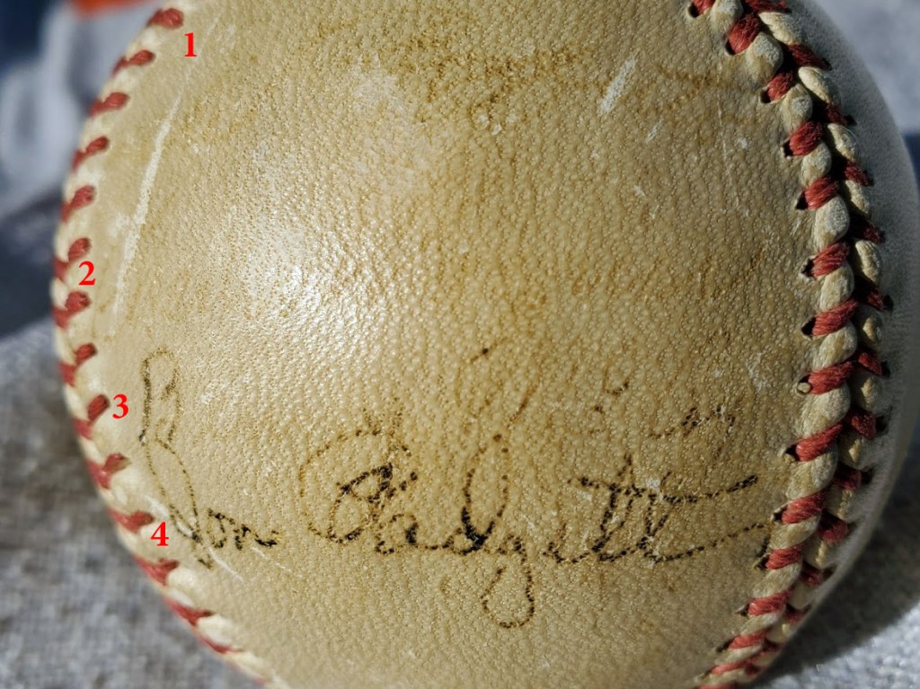 A close examination of the signatures revealed that there were at least ten autographs present on the ball; however, only a few of them were discernible. On the panel with the most prevalent autograph of Don Padgett, three other significant signatures were discovered. In order, ascending from Padgett’s ink are Benny McCoy, Charlie Wagner and Phil Rizzuto. Of the players on the Bluejackets, Rizzuto is the only one to be elected to the Baseball Hall of Fame. The 13-year veteran shortstop played his entire career with the Yankees and was voted in by his peers (the Veterans Committee) in 1994. There is another signature between Wagner’s and Rizzuto’s that we were unable to see well enough to identify. All four of these visible signatures can be seen not just with the ink but also their pen impressions in the horsehide.