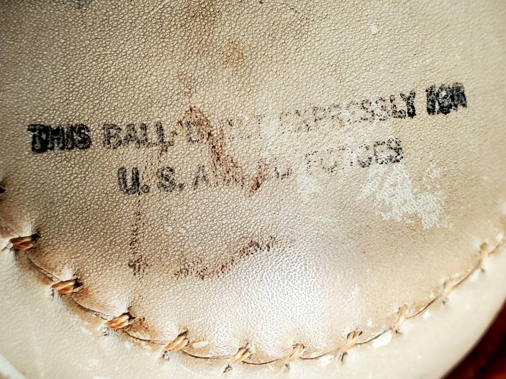 The stamping on the ball that truly captured our attention was the one that indicated service use. Quite obviously applied with a flat rubber stamp (as noted by the heavier ink on the extremities), “THIS BALL BUILT EXPRESSLY FOR U.S. ARMED FORCES” was a departure from the more commonly used “U.S.”, “U.S.N.”, “Special Services U.S. Army” and “U.S. Army.”