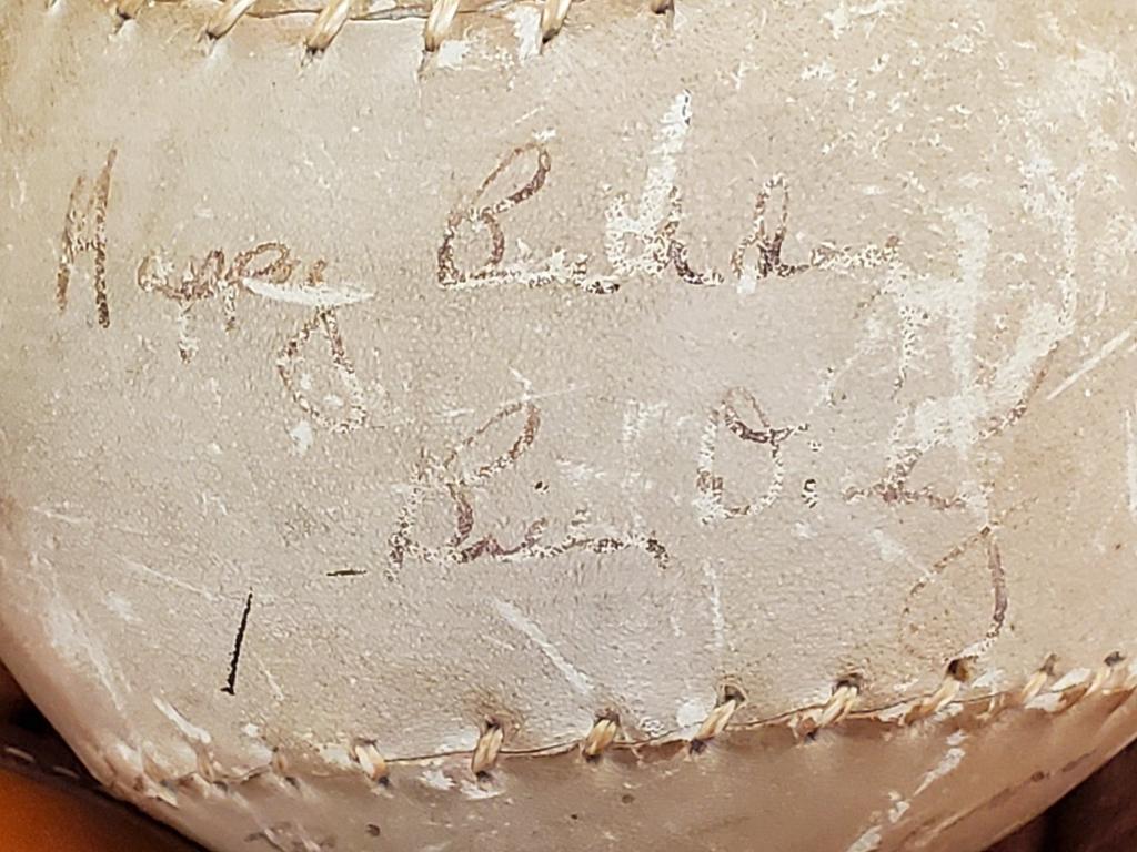 The ball’s covering was quite obviously aging and the signatures had significantly faded. In-person analysis of the signatures removed any doubts that remained at the time of purchase. Confirming both Dickey’s and Herman’s writing, we started on the line directly above Dickey’s autograph and realized that it was not only applied using the same pen as Bill’s, but it was written by the same person. Rather than the writing being a signature, instead we noted that it was a birthday greeting that was also written by Dickey.