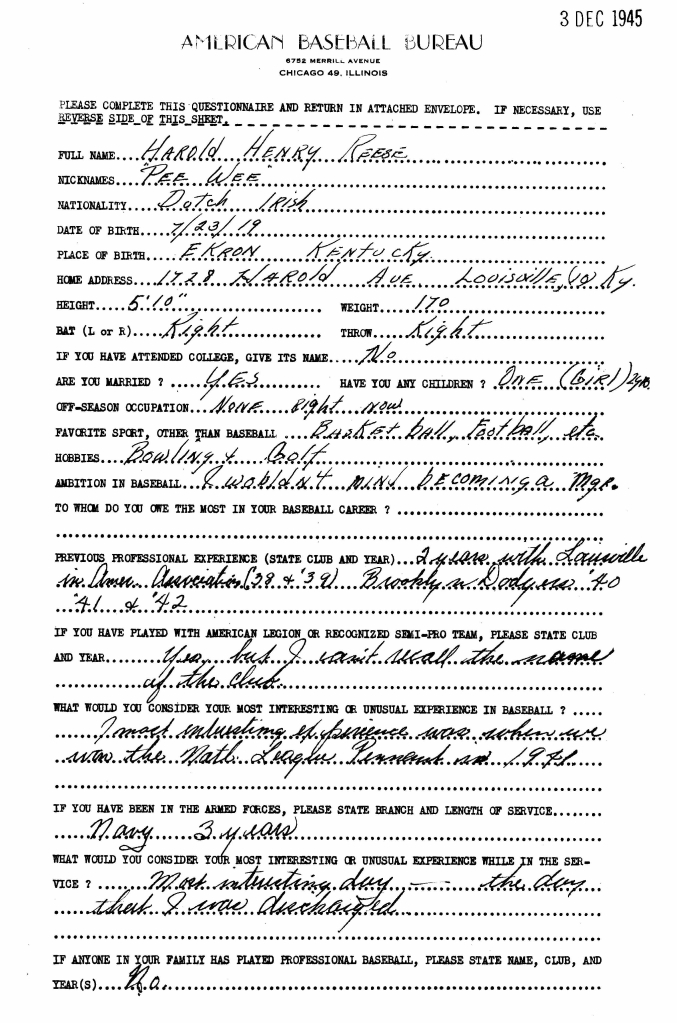 In the office of the Brooklyn Dodgers, club President Branch Rickey hosted a WWII veteran and former Army officer, Jack Roosevelt Robinson. A 26-year-old infielder who played the 1945 season with the Kansas City Monarchs, Robinson publicly signed a minor league contract that was previously negotiated in August. With the Monarchs, Robinson had appeared in 33 games at shortstop, Pee Wee Reese’s natural position, and one at first base. The Dodgers were taking a significant step forward that was about to change the face of minor and major league baseball as well as the Dodgers’ future roster and Reese had yet to learn of what awaited him.