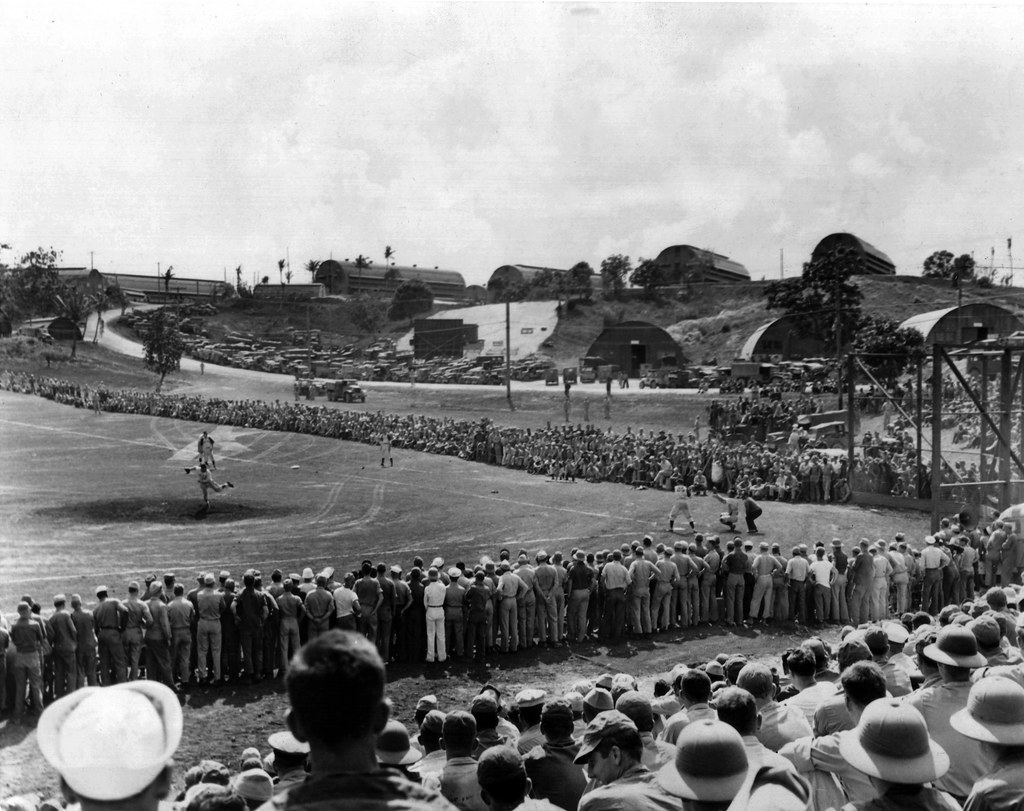 The ballfields on Guam were rudimentary, with simplistic features such as backstops and dirt or coral playing surfaces. Venues such as Gab Gab and Geiger Fields were quite literally carved into the landscape by Seabees using heavy equipment. In the high temperatures and humidity, the sunlight would heat the ground which, in turn, reflected the heat upwards to make play fairly miserable. When Pee Wee Reese wrote home about the conditions, his wife, Dorothy, dispatched a rather heavy care package that took a mere three months to reach her sailor husband on Guam. Inside the box, Pee Wee found 20 pounds of Kentucky blue grass seed. “Pee Wee planted it immediately,” the Louisville Courier-Journal reported on July 25, 1945. “He waters it daily and has it protected with several ‘Keep off the grass’ signs.”