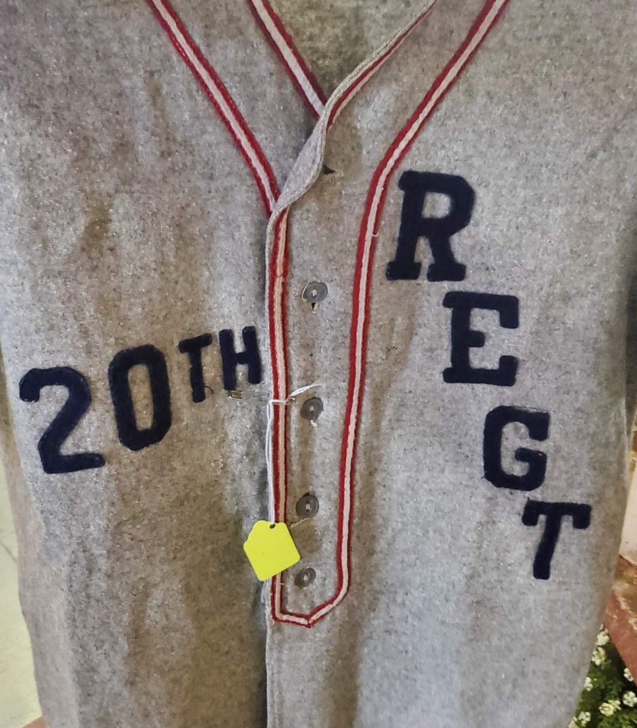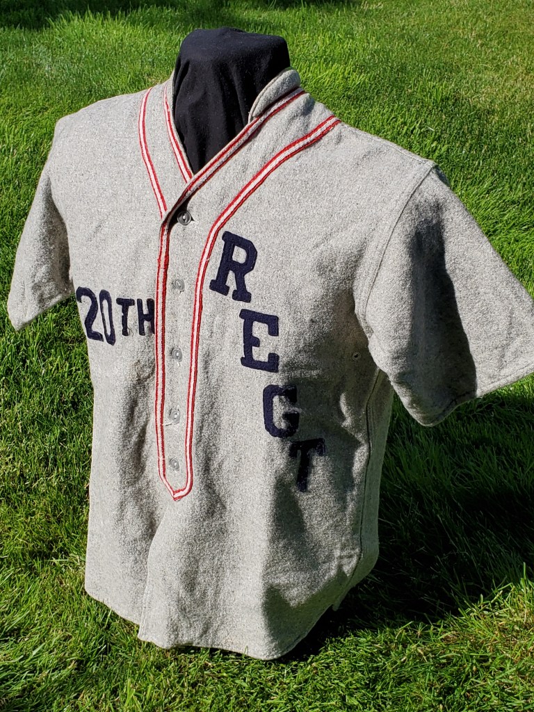 The navy blue athletic flannel lettering spelled out “20th REGT” on the chest of the gray flannel jersey, was intriguing and piqued our interest. The flannel had been shared in a social media post in a baseball memorabilia collectors’ group that was brought to our attention by a colleague prompting us to research what could be discerned from the accompanying photos. The item was quite obviously a wartime baseball flannel jersey and the person who shared photos of his find discovered the artifact in an antiques store. “I found this today in Missouri. It is an old military baseball jersey,” the accompanying text stated. “Is it worth $45?” he asked.