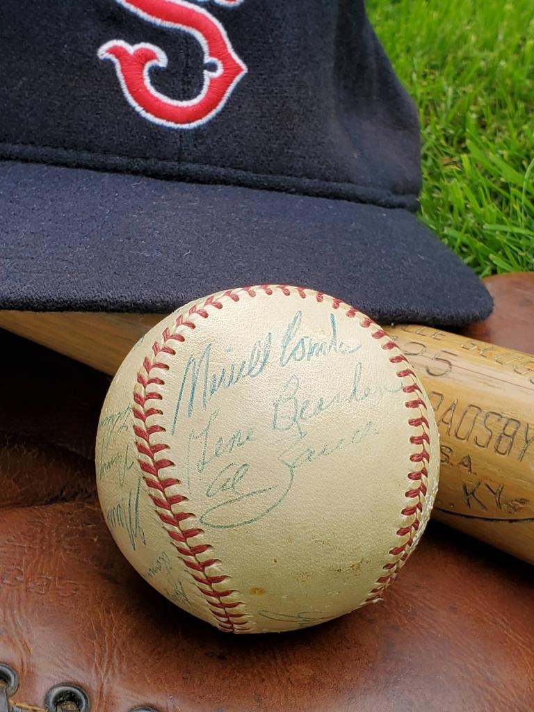 While Priddy’s signature on one of the two sweet spots lends to dating the ball to 1954, the presence of other players indicates that it spans two seasons starting in 1953.