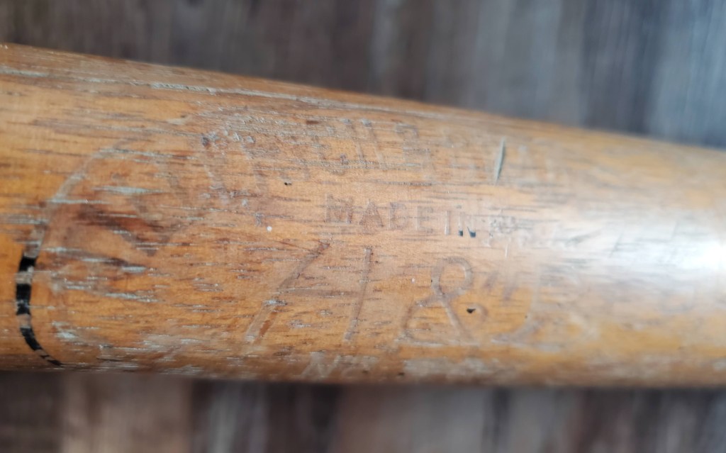 With retail or store-model bats, the brand and model markings are lightly applied with stamps and colored foil (most often black) to simulate the burned brands seen on professional bat models. Through normal use, the foil flakes away, leaving a faint indentation that is barely discernible. One of our earliest non-military bat acquisitions, an early-1950s, Ferris Fain signature, store-model bat, was completely devoid of the black foil. After cleaning and reconditioning the wood, we carefully restored the brand, model markings and Fain’s facsimile autograph with display-worthy results (see: Close to Completion: Restoring a 1950s Ferris Fain Signature Model Bat).