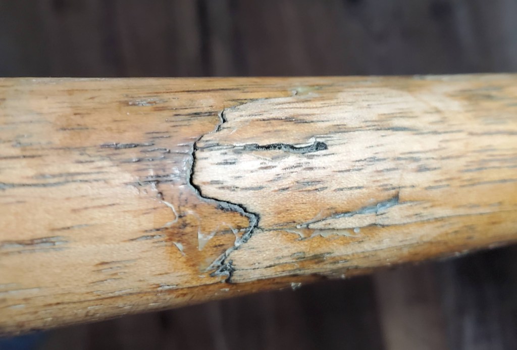 Both of our Mel Ott bats showed significant use, including breakage and field repairs in order to extend their usefulness. Broken bat handles complicated our rejuvenation process, adding multiple steps as we strove to maintain the aged appearance. After gluing a break, the removal of excess glue and the smoothing of the wood surface required abrasives such as sandpaper which easily cleared away the oxidized top surfaces and left behind a new, lighter surface.