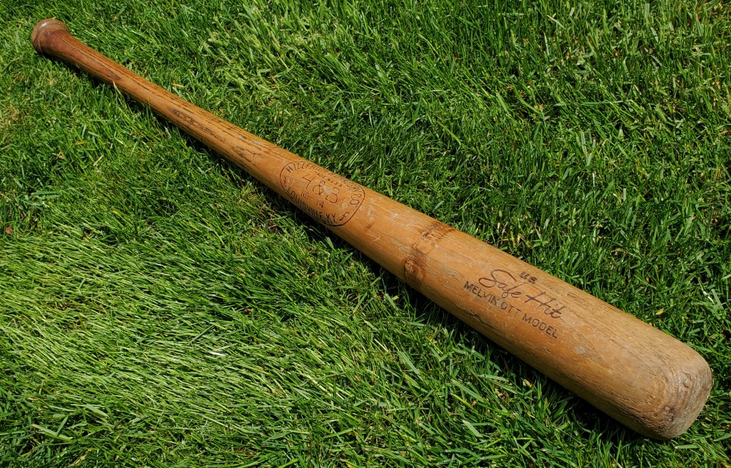 Describing our second Mel Ott bat as a basket-case would be a mild description. With nearly all of the black foil worn or flaked off, little remained of the contrasting markings. Fortunately, the impressions were quite deep, leaving the brand, model number and signature somewhat visible. The upper third of the handle was wrapped in grip tape, leaving a rather unusual appearance. Applied decades ago, the tackiness was long gone, having left behind an almost shell-like covering over the handle. To properly preserve and revitalize this piece, the tape was removed, revealing a sizeable crack. As with the Safe Hit Ott bat, the ensuing crack repair was minimal in order to preserve much of the aged and worn appearance while providing stability to the bat.