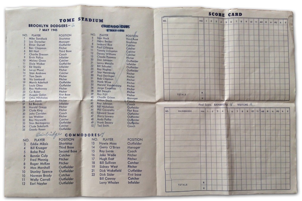 Though Sullivan never mentioned playing baseball while serving and few records document him taking the field while he served, he did make an appearance with the Commodores baseball team of the Naval Training Center in Bainbridge, Maryland in May, 1945 (1945 Brooklyn Dodgers vs Bainbridge Commodores scorecard). While he was attending training at Harvard University from March 1 through June 29, Sullivan was listed as a catcher for the Commodores during their games on Monday, May 7, when they hosted his former team, the Brooklyn Dodgers, and again on Tuesday, May 8, when the Chicago Cubs were scheduled.