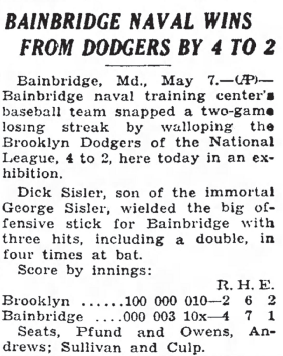 The Dodgers opened the scoring, plating a run in the first inning off the Commodores pitching but were held scoreless through the next seven innings. The Commodores rallied behind former New Orleans Pelican Dick Sisler’s 3-4 offensive performance with a three-run output in the bottom of the sixth. Bainbridge scored again in the seventh, taking a 4-1 lead until Brooklyn scored their second run in the top of the eighth. Sullivan’s exhibition performance was at a level better than pitching batting practice as he held Dodger batters to six hits. It was enough to secure the win for the sailors in a tight contest.