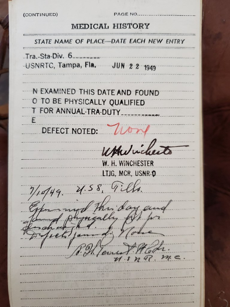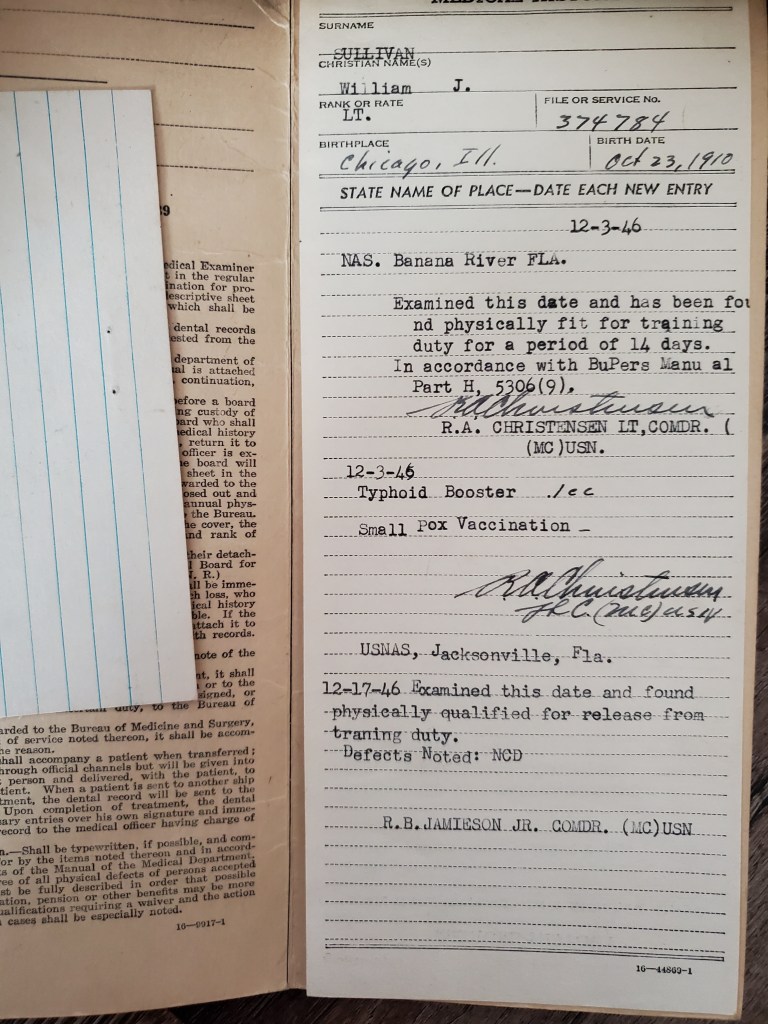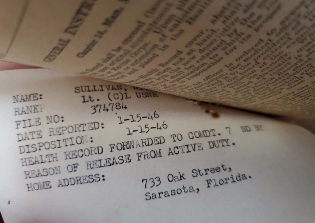 On January 15, 1946, Lieutenant Sullivan was released from active duty but continued serving in the Navy as a reservist with medical evaluations through June 1949.