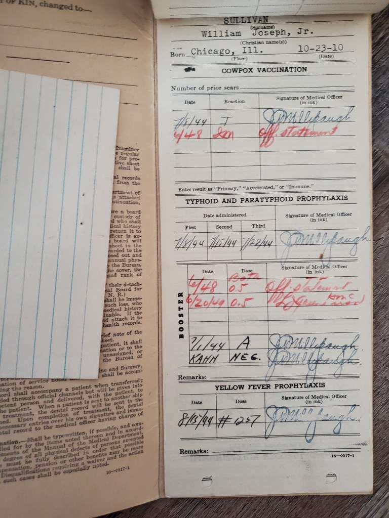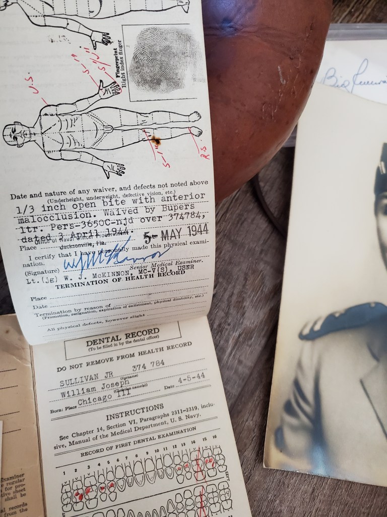The artifact that accompanied Sullivan’s portrait is his U.S. Navy Health Record. In addition to his basic intake physical and his physician’s observations, the record documents Sullivan’s inoculations and dental history, Billy Sullivan’s health record provides a timeline of service and duty assignments.