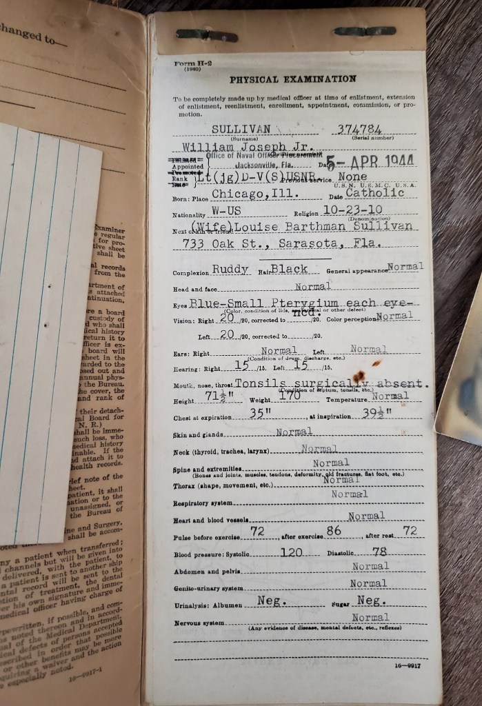 With 11 seasons in professional baseball, “I applied for voluntary retirement, which I did,” he told Murdock. Sullivan stepped away from the game in March of 1943 but he didn’t enter the service, spending the balance of the year working as a government building contractor in Florida. William Joseph Sullivan, Jr. was commissioned on April 5, 1944, and appointed to the rank of Lieutenant junior grade in the U.S. Navy.