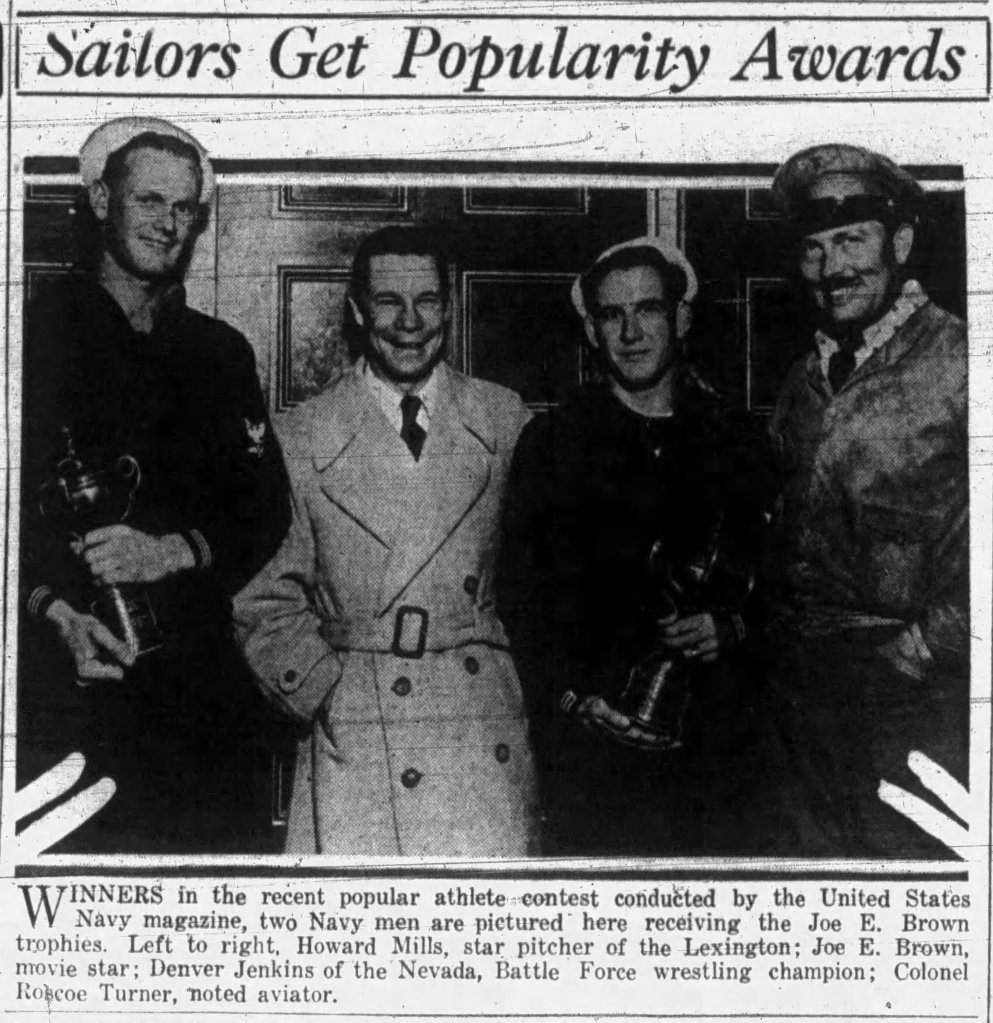 The 1933 season opened the door of opportunity and recognition for Mills. With professional scouts from the major leagues and the Pacific Coast League attending his games and making note of his talent, the future was decidedly bright. Scouts from the St. Louis Browns and New York Yankees were jockeying for position to sign the pitcher. U.S. Navy Magazine conducted a poll for the “most popular athlete,” to which readers overwhelmingly elected Mills as the winner. In early January, 1934, actor-comedian and baseball fan Joe E. Brown presented Howard Mills with a trophy and keys to a new Ford coupe. Likely unaware of what the future held for him at that time, Mills was almost dumbfounded at the idea of receiving a car at that point in his Navy career. “What was I going to do with a motor car when I just had signed up for two more years in the Navy?” a question Mills later posed to writer Henry P. Edwards for a January 1, 1939 American League Service Bureau press release.