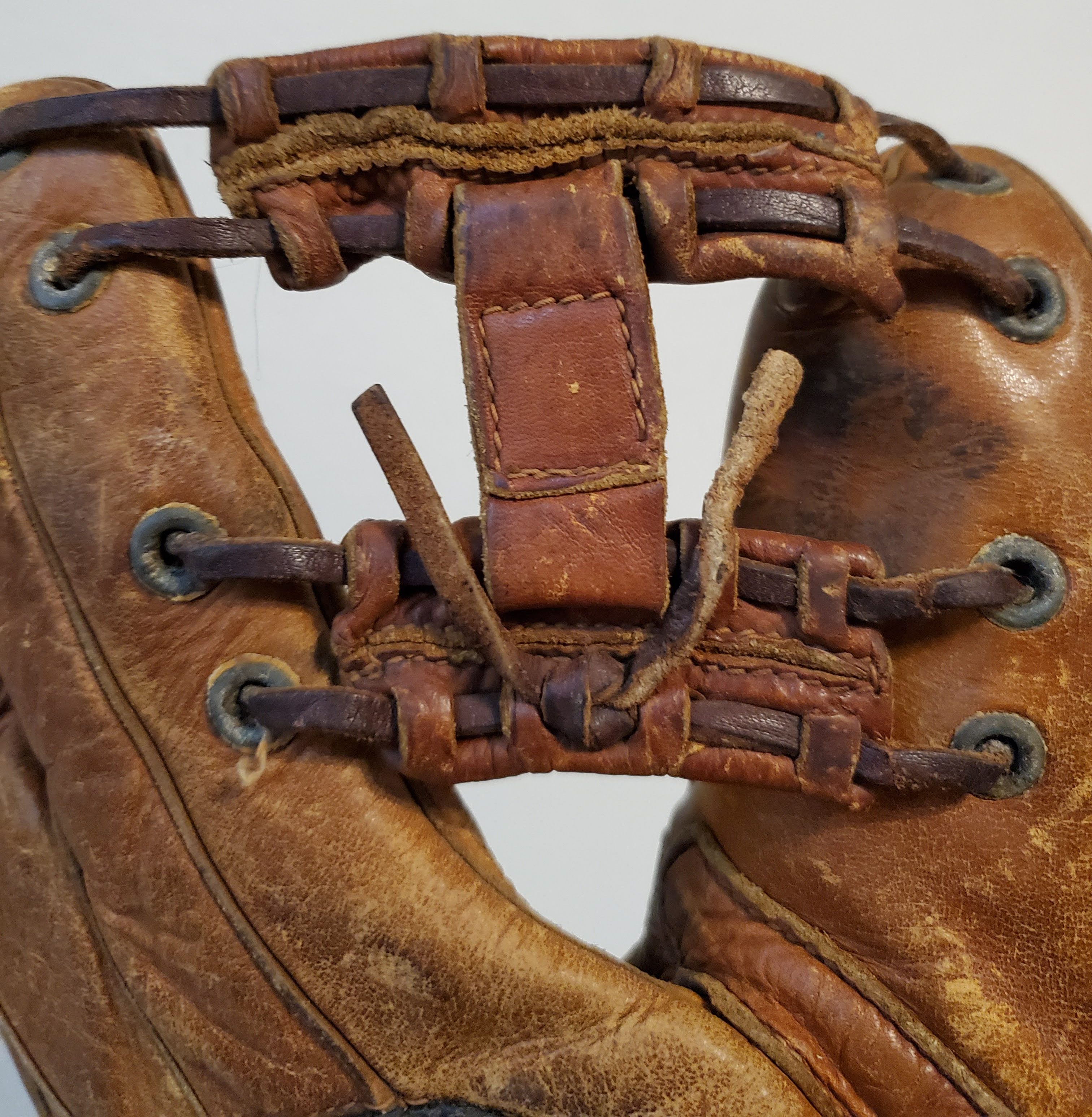 The webbing and lacing in the Elmer Riddle “DW” U.S.N. stamped glove is in good condition. The eyelets show some degree of verdigris but will improve with cleaning (Chevrons and Diamonds Collection).