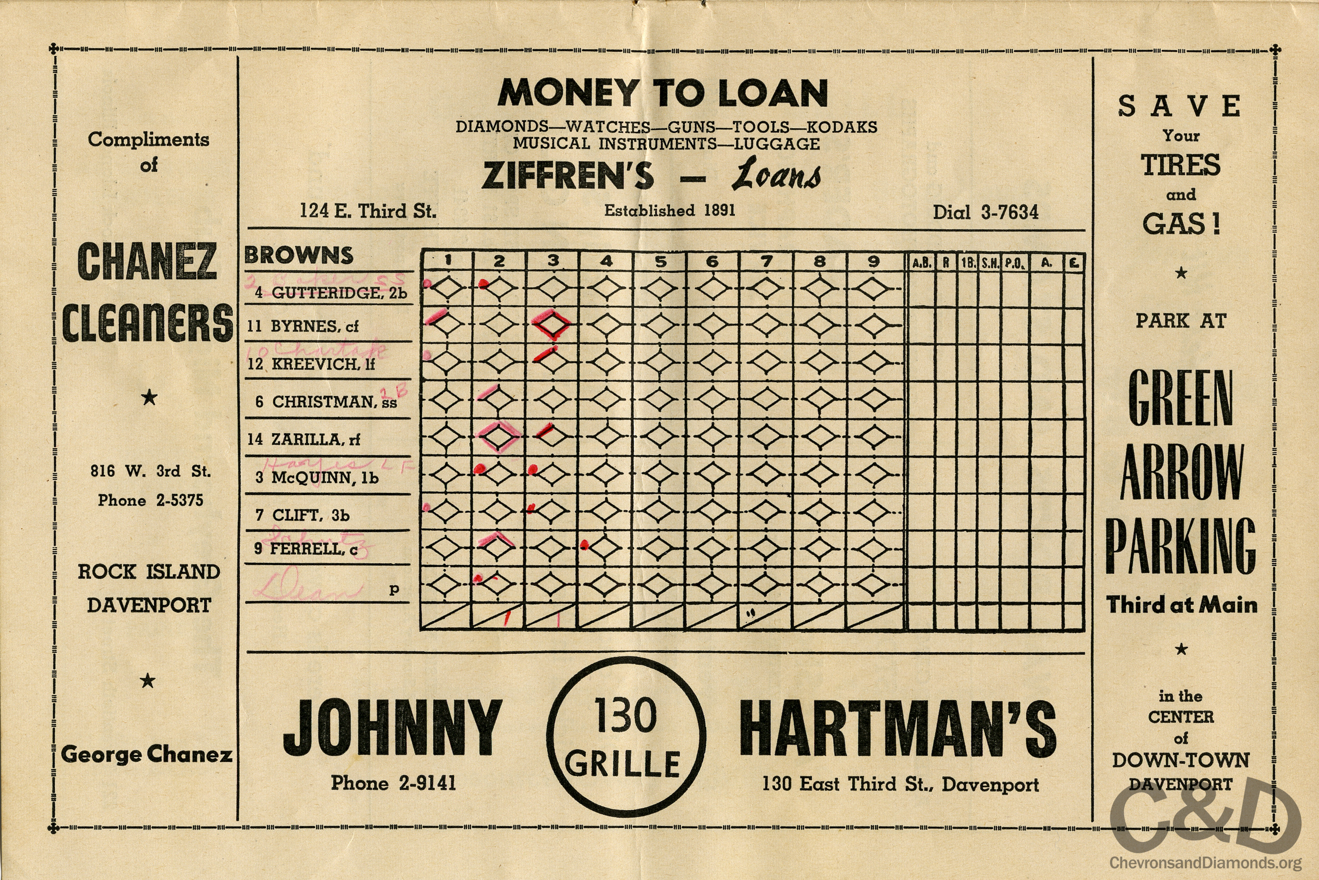 This copy of the game’s scorecard is a recent arrival to the Chevrons and Diamonds Collection, donated by a baseball historian, colleague and friend. From the front cover to the back, the program consists of 12 pages, with the majority of the content being dedicated to advertising support. In addition to the team scoring grid pages, separate pages include the team rosters (view the complete scorecard).