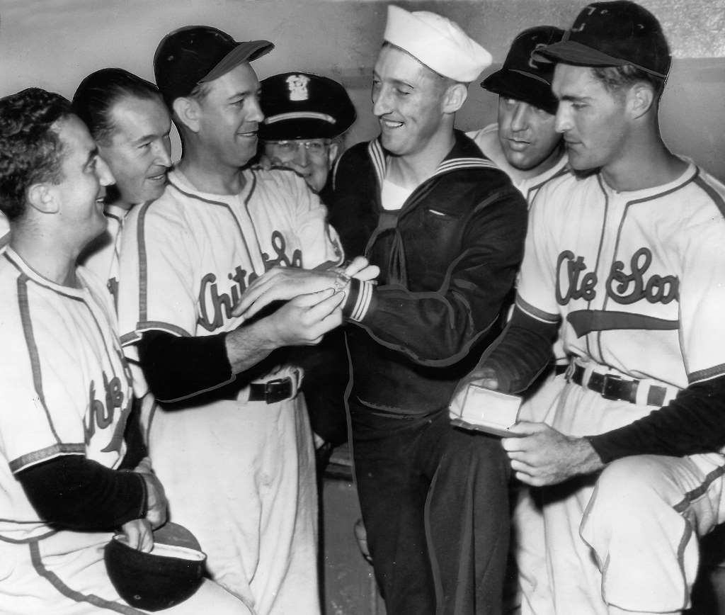 Before the game started, the two teams engaged in field events that included 100-yard dash races, a long-distance throwing competition and throwing for accuracy. It was all business when the Browns took the field for the top of the first inning and Dizzy strode to the mound. For several weeks, Dean had worked on strength training and other conditioning, ensuring that his arm was in peak form. Marine second baseman Boldt and left fielder Dagle were retired for the first two outs but SSGT Hallet doubled off Dean. He was gunned down by right fielder Al Zarilla as he attempted to stretch the safety to a triple. Lyons retired the side in the bottom of the frame, with both teams coming up empty. The Browns struck first in the bottom of the second inning following Zarilla’s single. Marines catcher Wallraff muffed a pitch, allowing Zarilla to reach second on the passed ball while a throwing error by shortstop Hallet moved the runner to third. Joe Schultz singled to drive Zarilla home. The Marines countered in the top of the third, with successive hits by Callewaert and Dagle evening the score, 1-1. Dean’s night was done, his having surrendered five hits and striking out one. Archie McKain took over for Dean to pitch the middle three innings.