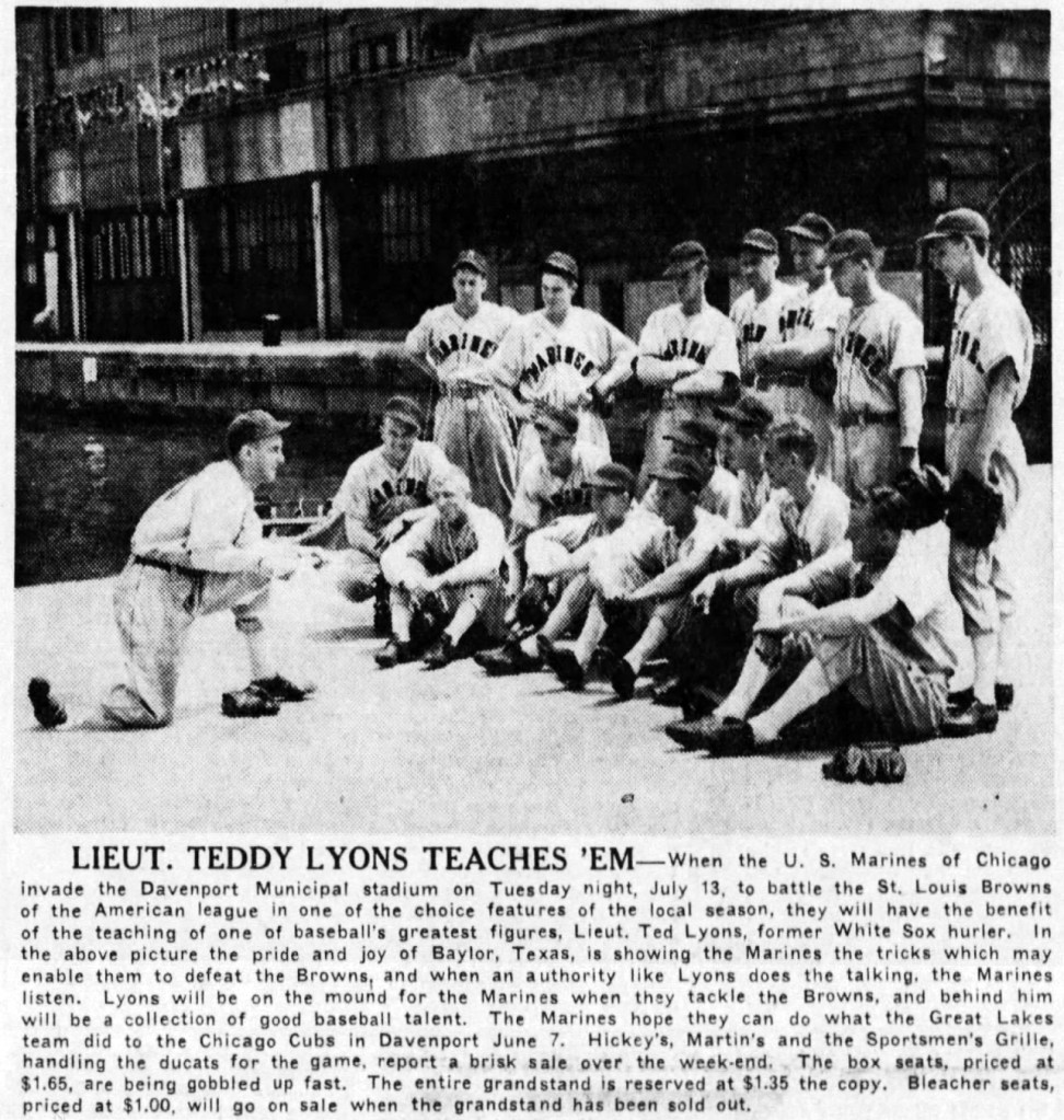 More than two weeks following Mickey Cochrane’s Great Lakes Naval Training Station Bluejackets’ 5-1 victory over the Chicago Cubs, Davenport, Iowa’s Quad-City Times announced on June 25, 1943 that an exhibition game would be played at Davenport’s Municipal Stadium (known today as Modern Woodmen Park), home of the independent league Maroons. Arranged by the Quad-City Athletic Club, the contest was set to bring major league baseball back to the small ballpark situated above the levy on the bank of the Mississippi River, with a big league club facing off against a service team from the Windy City of Chicago. “We had a chance to book several service clubs in here for that night,” club president Jack Lagomarcino told the Quad-City Times. “But when we heard that Teddy Lyons was pitching for the Marines in Chicago, that was all we wanted to know.” Lagomarcino continued, “We got in touch with him and his officers, and they agreed to the game.” Anticipating drawing a large crowd, the ballpark was expanded by 1,500 to accommodate 8,000 fans for what was being billed as “Ted Lyons Night” on July 13.