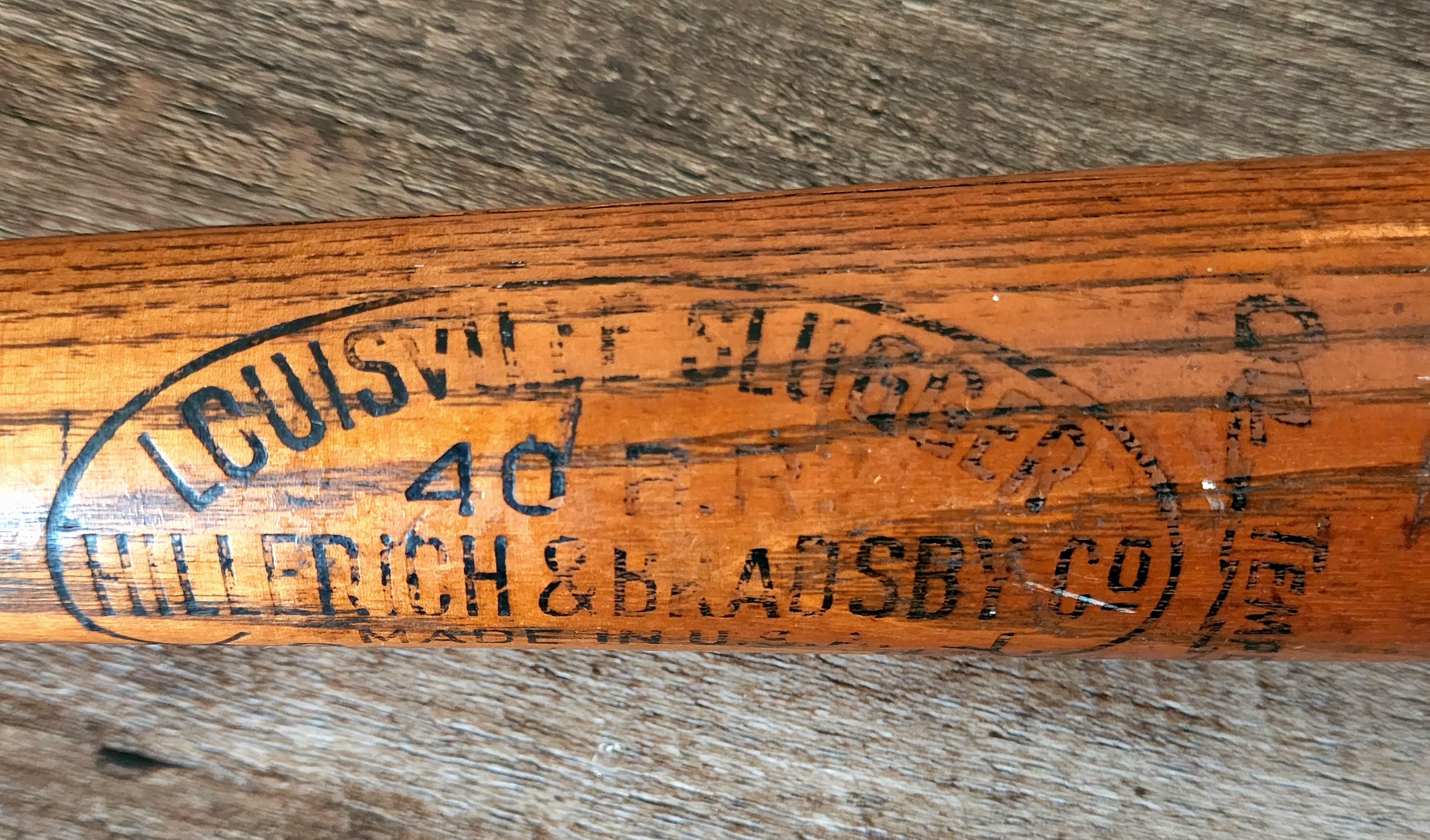 Could this be one of the marked bats that we had been seeking? Uncertain if any of these survived nearly eight decades, an email was promptly dispatched, seeking photographs of the piece in question. The response answered the question. Since our collection already featured two of the scarce Professional Base Ball Fund-marked baseballs, the marking on the bat clearly matched and confirmed suspicions. The photos included close-in captures of the center brand and the player endorsement stamps. The model 40BR was a retail or “store-model” bat and was lightly stamped with black foil instead of the burned-in, deep impressions featured on professional models. Unfortunately, a significant amount of the black foil was worn, which commonly occurs with game use, handling, and decades of oxidation. Other condition issues included considerable wear on the knob and barrel ends and a crack extending from high on the handle towards the barrel.