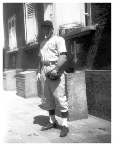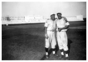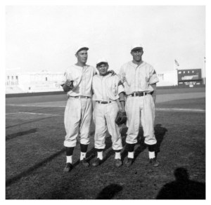 Then, I located Deborah Sharkey and she very kindly agreed to send me photos of her father. When her package came in the mail, I went through the dozen or so photographs she sent. One of them was of her father standing with Wilford Kale and the Mexican American ballplayer that I had given up hope of ever being able to identify. They were posing together in their baseball uniforms on at Soldier’s Field the site of the ETO baseball championships. On the back of the photo, Hess had written, “Nuremberg, Germany – Ortega, Hess, Kale – roommates on the baseball trip.” I was stunned, and even though I was alone, I pumped my fist in the air and shouted, “yes!” I knew at that moment that I would figure out who this ballplayer was.