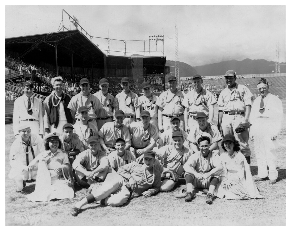 By the end of regular season play, the 7th captured the championship hardware, with the already-planned inter-service All-Stars championship looming for September and October. It was billed as the Servicemen’s World Series, a seven-game contest that pitted baseball stars from the Army against those of the Navy and was played solely at military facilities for the benefit of service personnel. Planning for the series began late in the summer and speculation began to swirl about prospective players being dispatched to the islands for the series. Three major league stars serving elsewhere in the Navy – Dom DiMaggio and Phil Rizzuto, both in Melbourne, Australia and Bob Feller, who was serving aboard the battleship USS Alabama – were the favorite contenders for the Series discussed in the local papers. However, by mid-September, only Rizzuto and DiMaggio were en route to Oahu. The operational necessities of the USS Alabama kept Feller out of contention for the Navy team.[7]